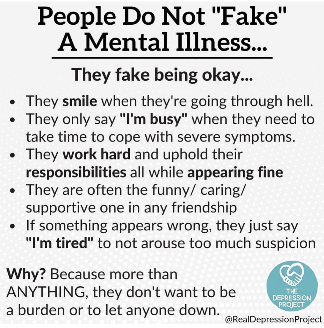 Good one, I admit I’ve been guilty of faking being ok. Just like was described, I will tell my family I’m ok, and just need some time alone,